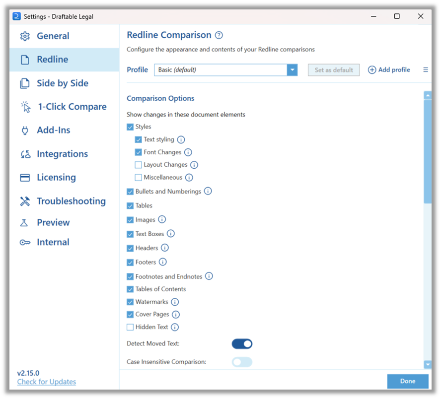 There are a large number of configurable options available within the Redline settings section. Here you can fully customize they way your Redline comparison appear, and this section aims to breakdown and explain how to configure each setting option.Profiles