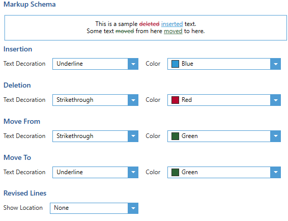 You can edit how the markup schema looks in your comparison or both insertion content, deletion content, moved content and revised lines. Customization include text-decoration and color for these detection’s, and a preview is shown whilst you make these selections.