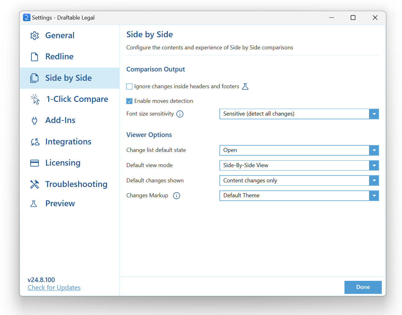 There are specific options for the viewer itself for side-by-side comparisons. Change list default state: This sets the default state for the change list that is shown when viewing comparisons.