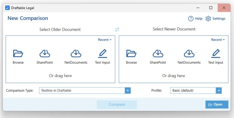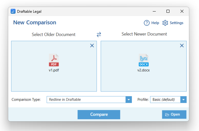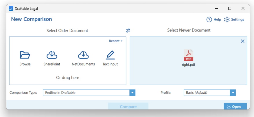 In the menu, click on “Start a comparison.” The Draftable Legal software will launch, and you should see the Draftable Legal New Comparison window appear on your screen with the comparison interface.