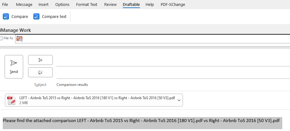 If you wish to compare documents that are attached in your email, in the Draftable tab select Compare Attachments.