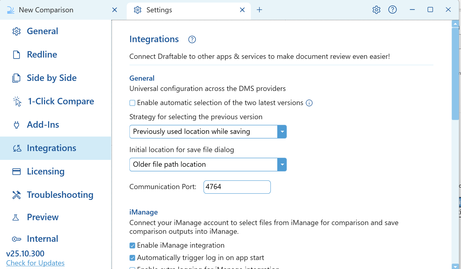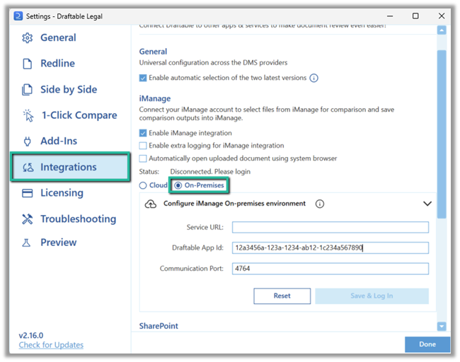 Now we need to ensure that we are logging into our On-Premise iManage account. Navigate to the Integrations section of the settings menu. Depending on what version of Draftable you are using, there are two different procedures you need to follow depending on the version.If you are using Draftable v25.9.300 or earlier: