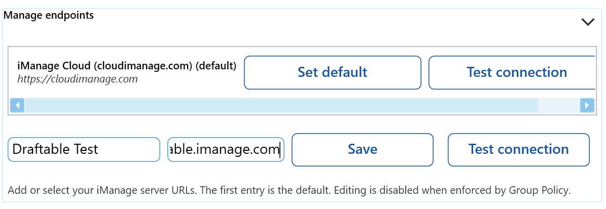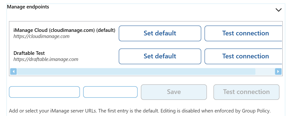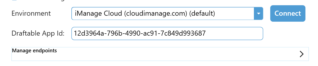 Enter your credentials for your iManage account (if they haven’t already been configured by Group Policy) by clicking the arrow in the “Manage endpoints” section.