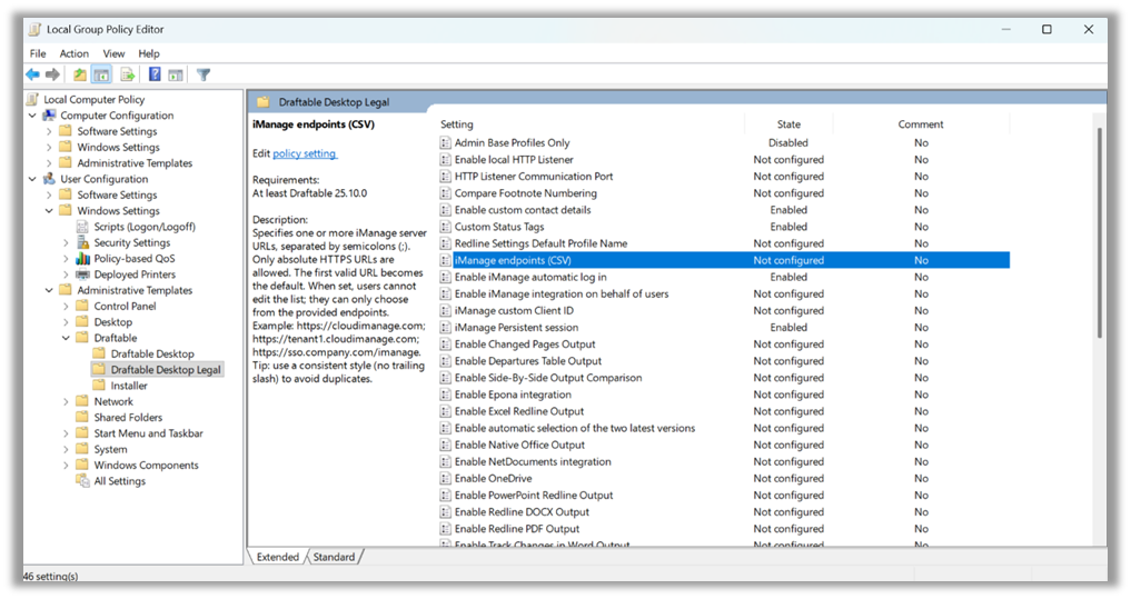 The two configurable fields for iManage on-premise integration with Draftable are the Enable iManage integration on Behalf of users, Service URL and Draftable App ID (or Client ID). You can configure this via group policy and follow the steps shown in this article. The image below shows what these group policy settings are.