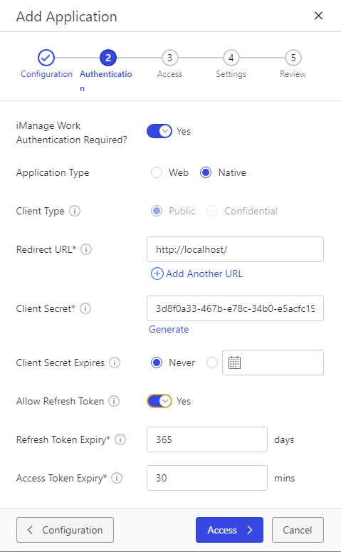 Again the information is prefilled, except for Allow Refresh Token, ensure this is ticked as Yes. Please also ensure you set the “Redirect URL” to “http://localhost/”. If this is not set you will experience issues with configuration as its required for correct integration with Draftable Legal.Once this is done, then click Access.