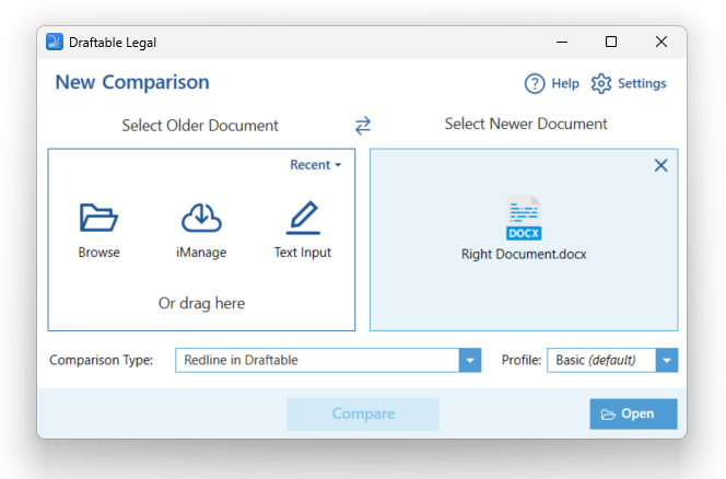The New Comparison window will open, with the document already preloaded for you (Note: to load the file into new comparison window, ensure the document is locally saved). Simply add the other document you wish to add to the comparison and hit Compare