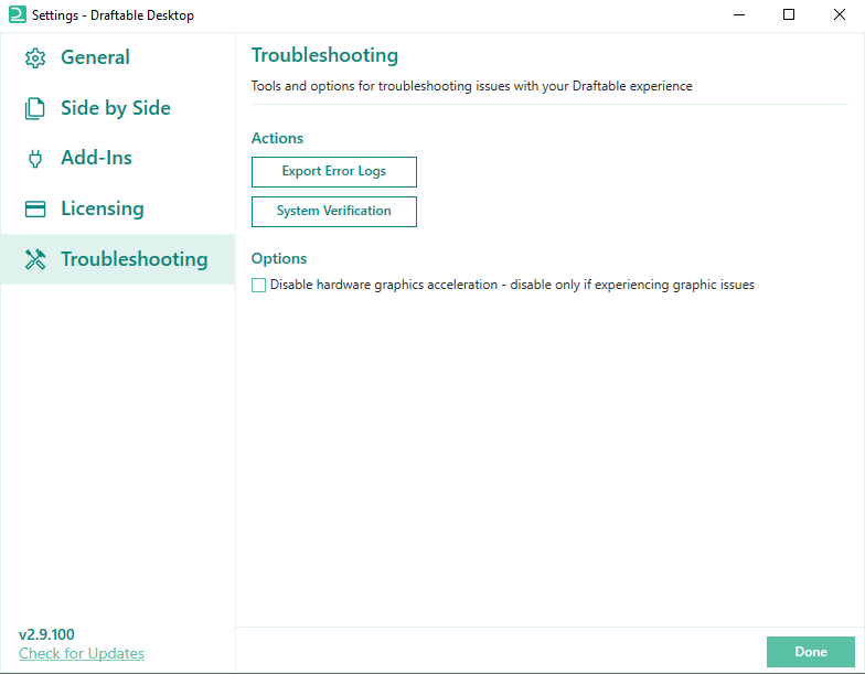 Select Export Error Logs, and send the output to our support team at support@draftable.com
