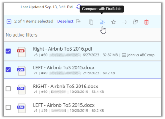 Select a file(s), then select the Compare with Draftable icon located in the toolbar.