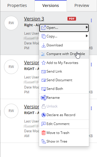 In the versions tab, select and right-click the document you wish to compare by opening up the context menu.