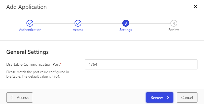 In the “Settings” window, ensure that the Draftable Communication Port is set to 4764. Then click Review.