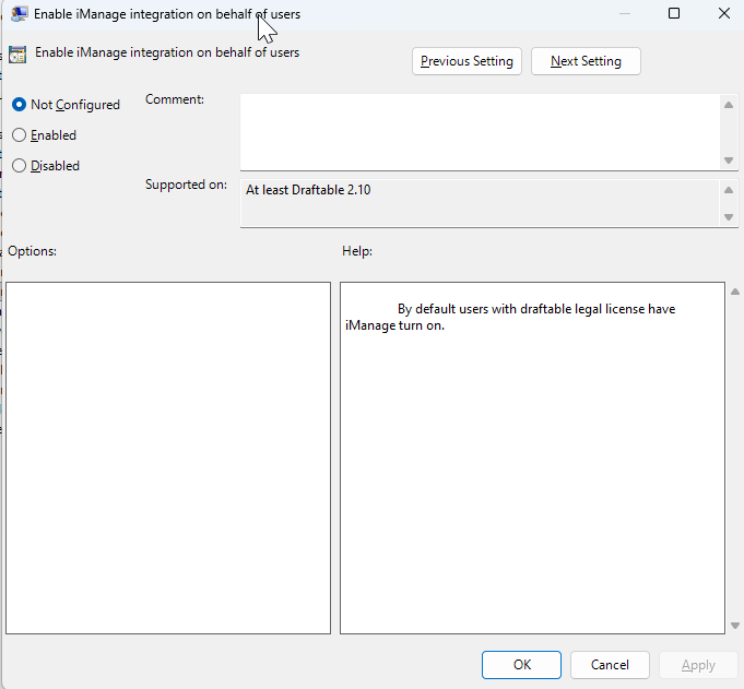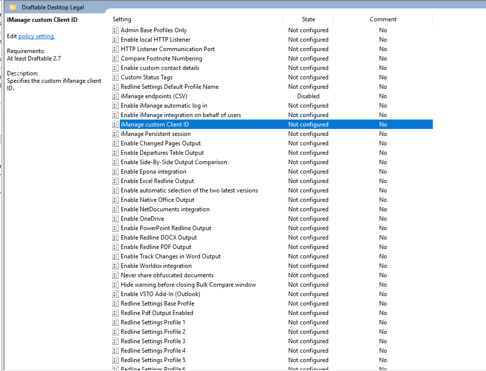 The three configurable fields for iManage cloud integration with Draftable are the, Enable iManage integration on Behalf of users, Service URL and Draftable App ID (or Client ID). The On Premise GPO options will also work for cloud as long as the service URL is entered the same as the cloud URL. You can configure this via group policy and follow the steps shown in this article. The image below shows what these group policy settings are.