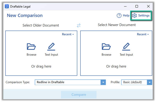 Open the Draftable Desktop (New Comparison Window) and select the ‘settings’ in the top right corner