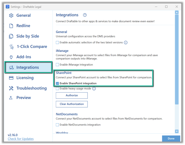 In settings, go to the Integrations tab, and under SharePoint click Enable SharePoint