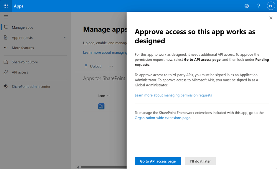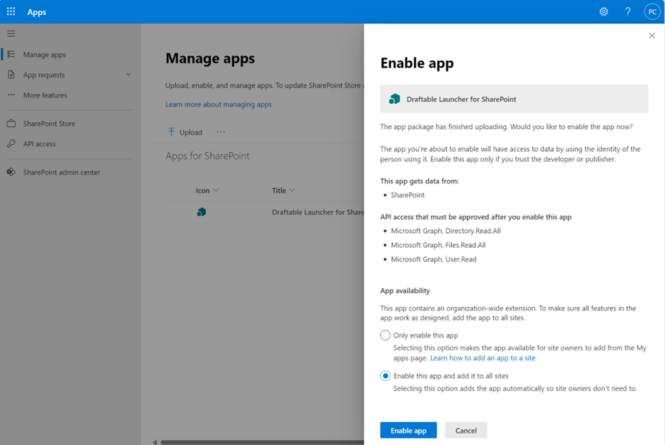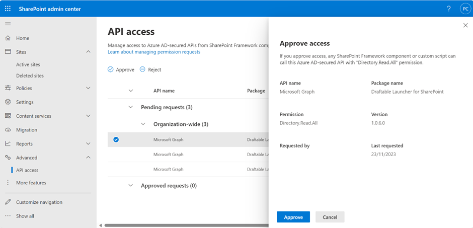 Note, once the Draftable App for SharePoint is enabled, API access for the following needs to be approved: