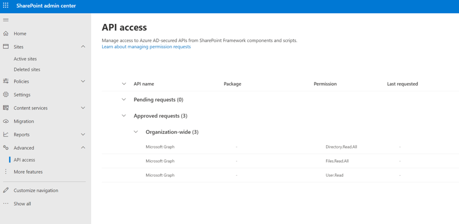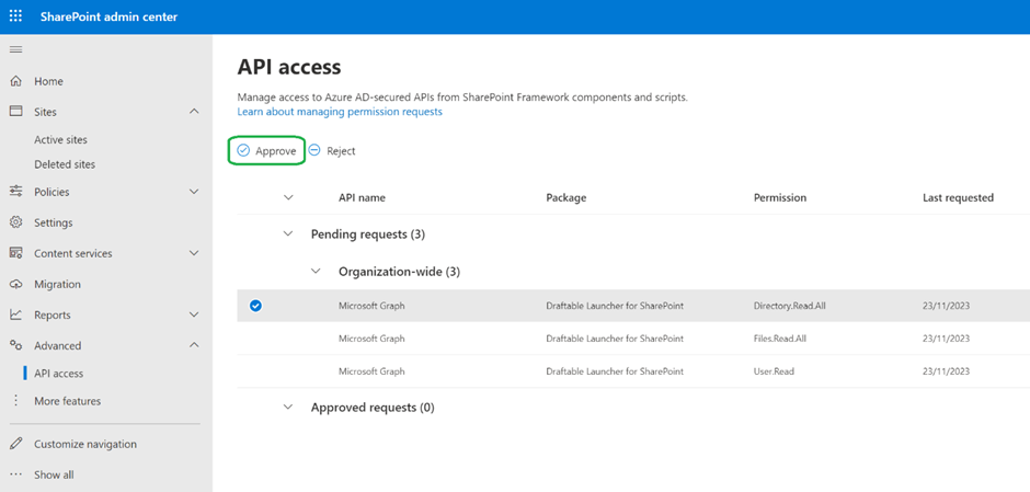 Under pending requests approve each of the following individual permissions: Directory.Read.All, Files.Read.All, User.Read, by clicking Approve.
