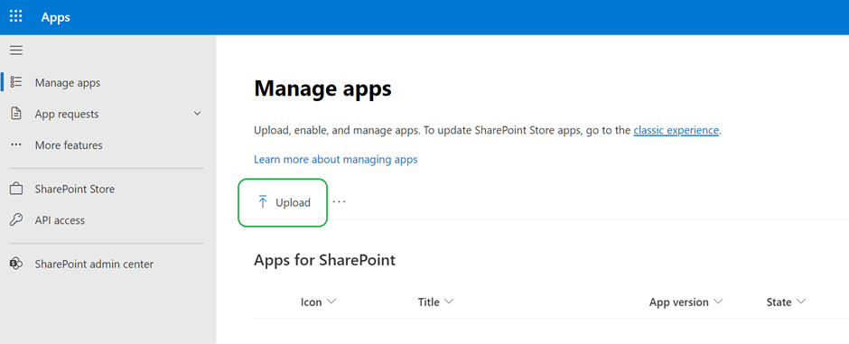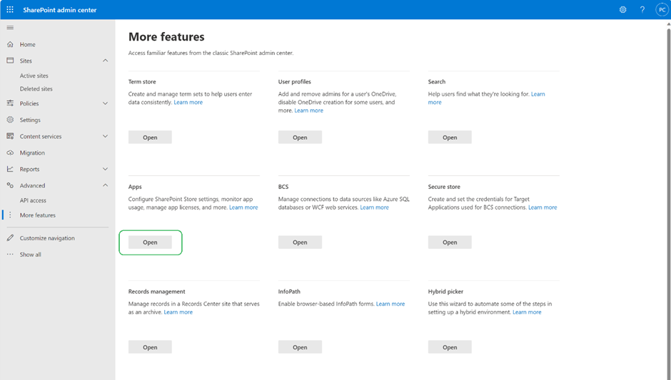 Login into your SharePoint Admin Center and navigate to More features then select Open under Apps
