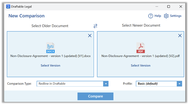 Regardless of whether you selected 1 or 2 documents, Draftable Legal will load the New Comparison window with the selected documents, ready for comparison.