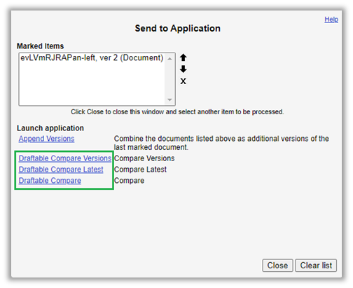 This will launch the Send to Application window. Verify the documents you have selected under Marked Items, and left-click on your preferred option (Compare versions, Compare Latest, Compare) to transfer these items into Draftable