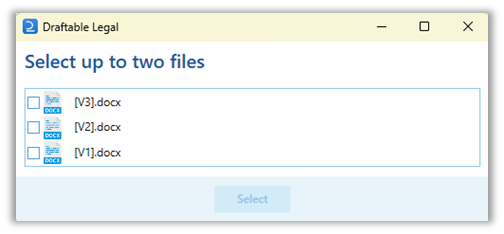For files with only 2 versions, this option will automatically load the two versions of the selected document. For files with 3 or more versions, this option will open the Draftable version selector menu to show a list of versions for loading. Users are able to select up to two versions for comparison, and then load by clicking ‘Select’.