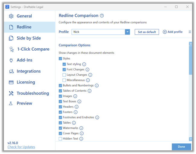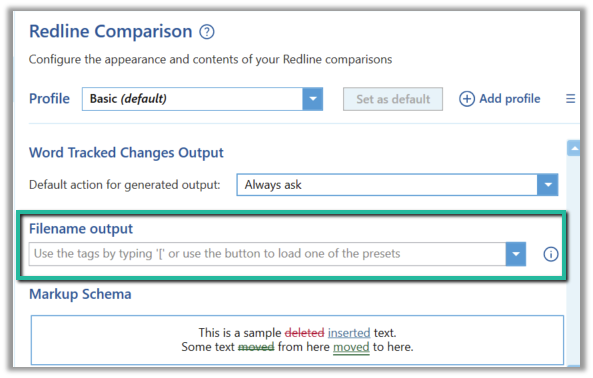 Using the information above we can create our own schema using any combination of tags and free text. Any free text used in the schema will appear on all comparison outputs. For example if you enter the text “Comparison Export” like shown below:
