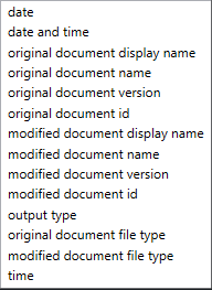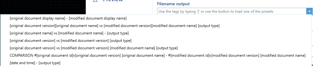 Tags are used to automatically prefill data in the Filename output, that is extracted from either the documents used in the comparison, the comparison itself, or from the installed machine itself (relevant for the data and time tags).