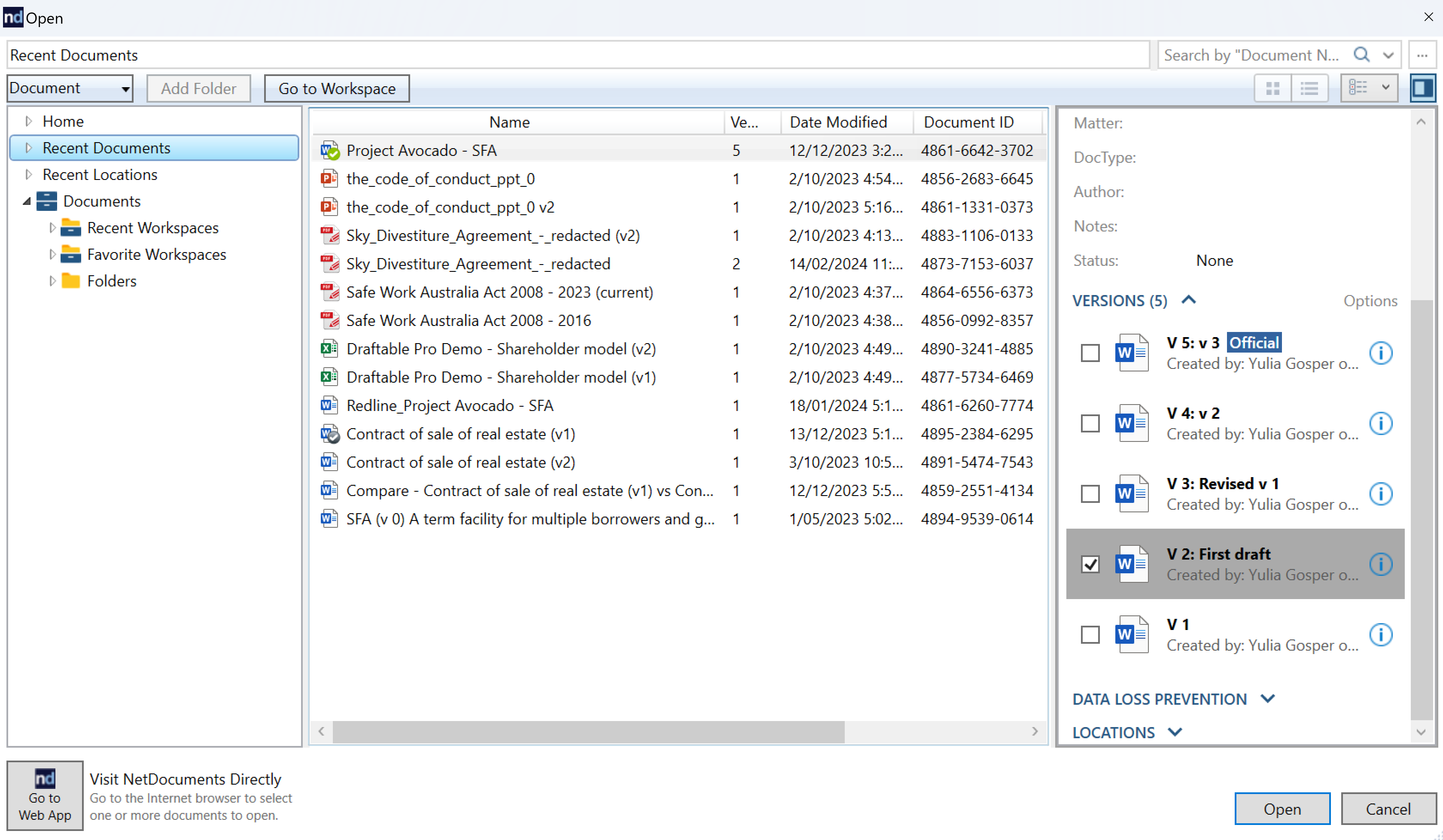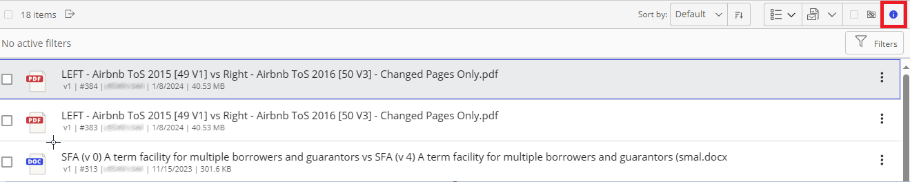 - Open the versions menu in iManage by clicking the ‘i’ (show details) icon in the top right of the screen and then selecting the ‘versions’ tab on the right-hand side of the screen. Then right-click on the version you want to load and select ‘compare’.