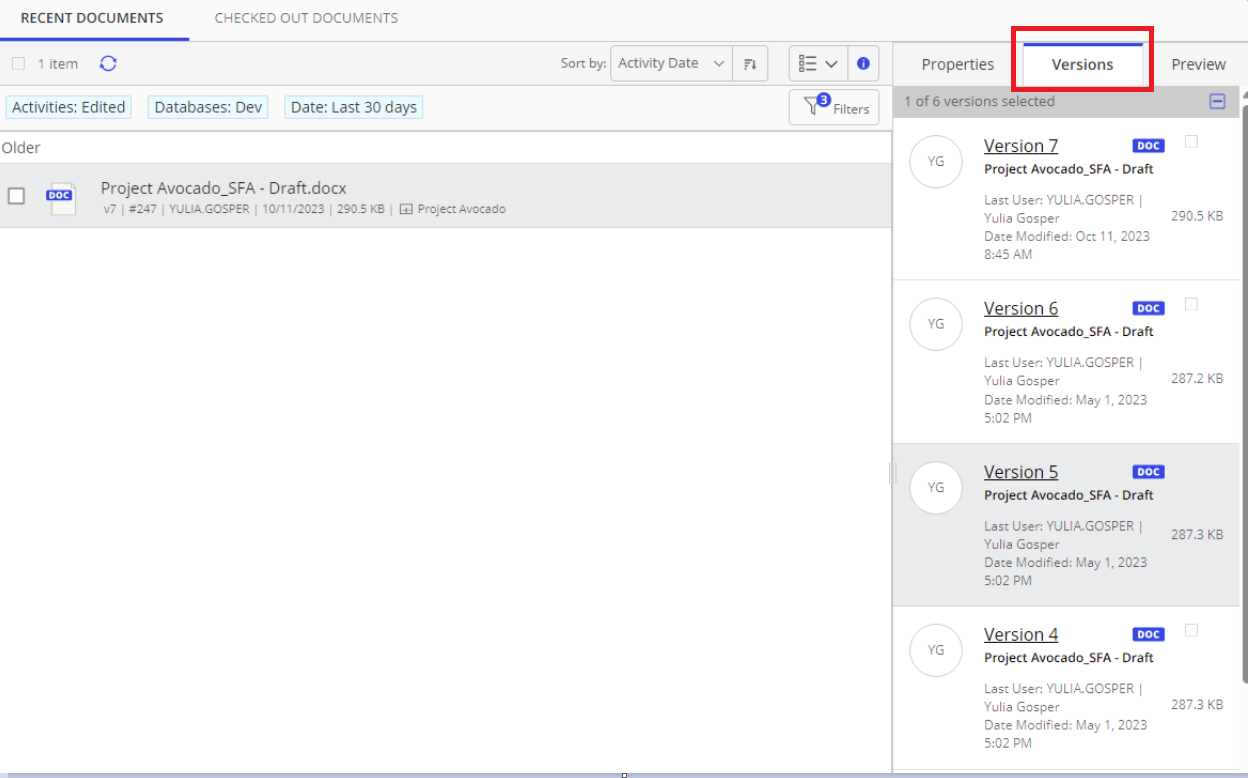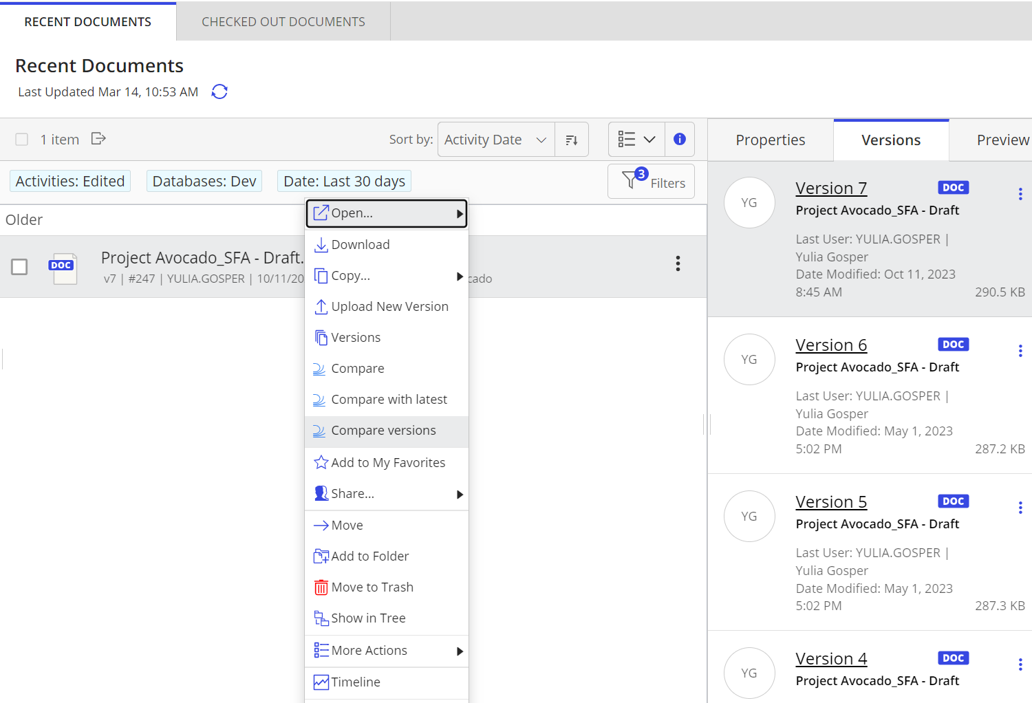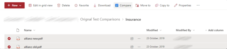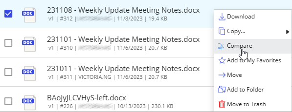 - ‘Right-clicking’ on the document and then selecting ‘Compare versions’, from where you will be able to select the version(s) you need (if you select ‘Compare with latest’ - the latest two versions of the document will be uploaded); or