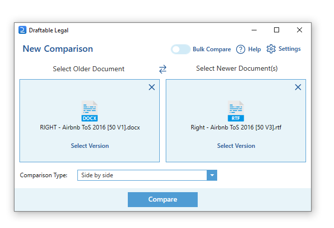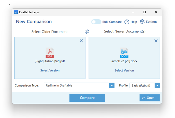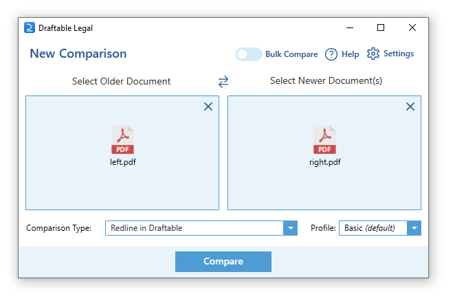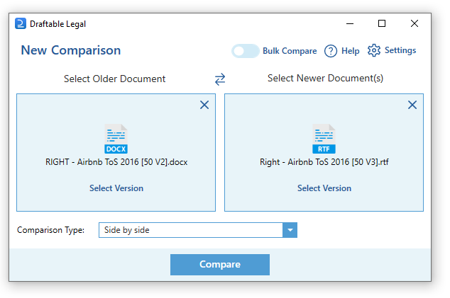 Click on the section or question below from the table of contents, to go directly to the answers you need for Draftable Legal Launching comparison & inputting files- How do I launch a comparison?