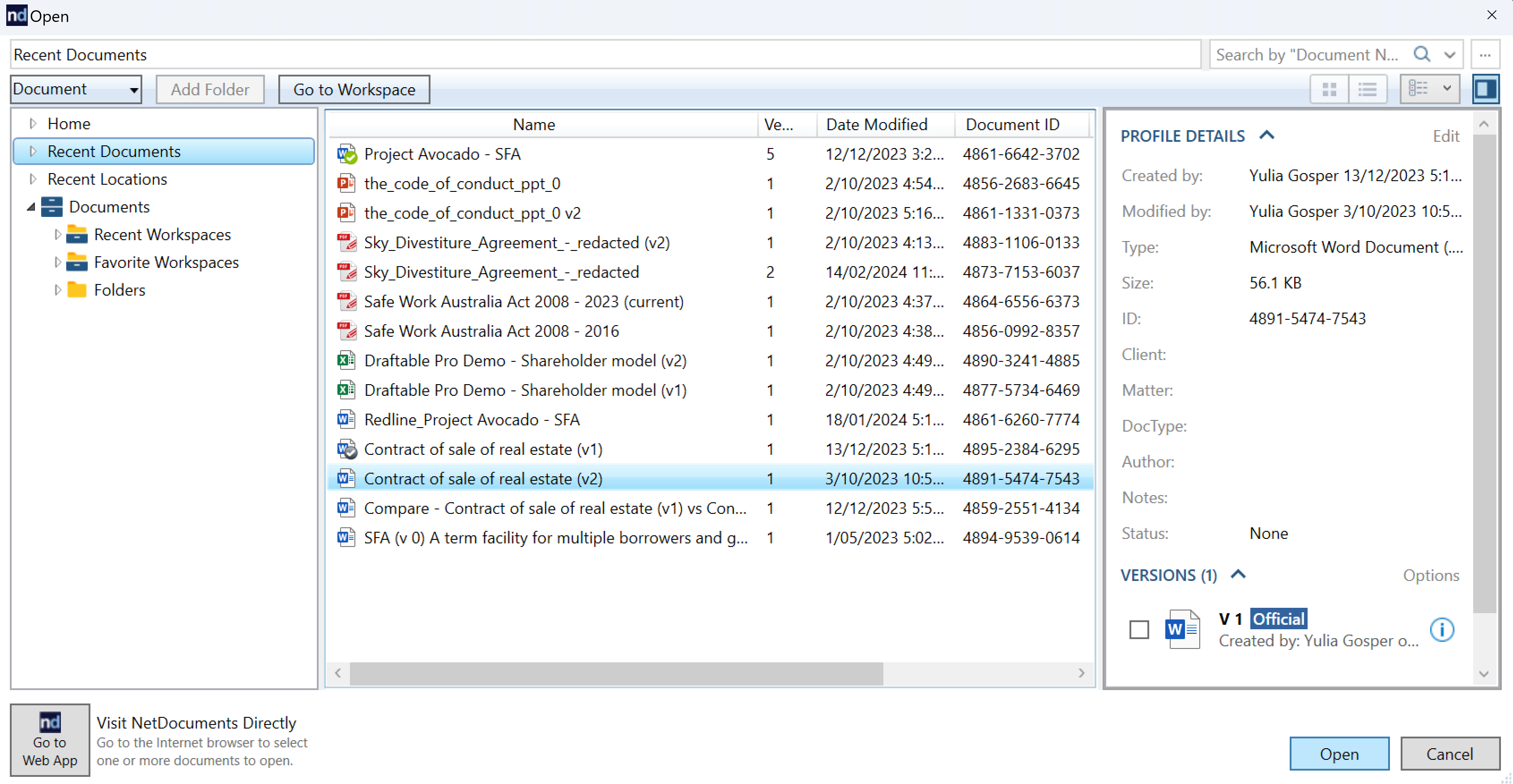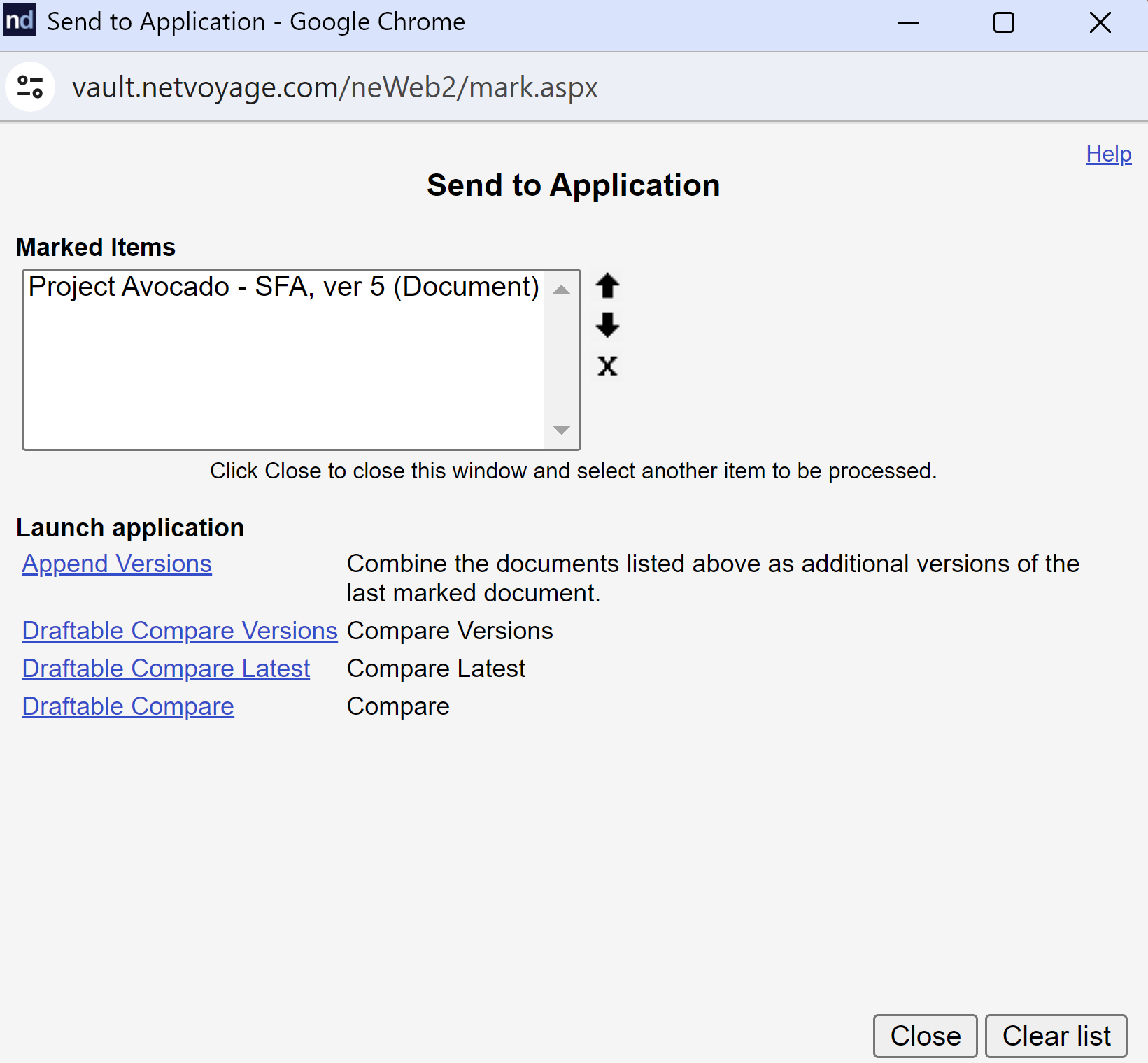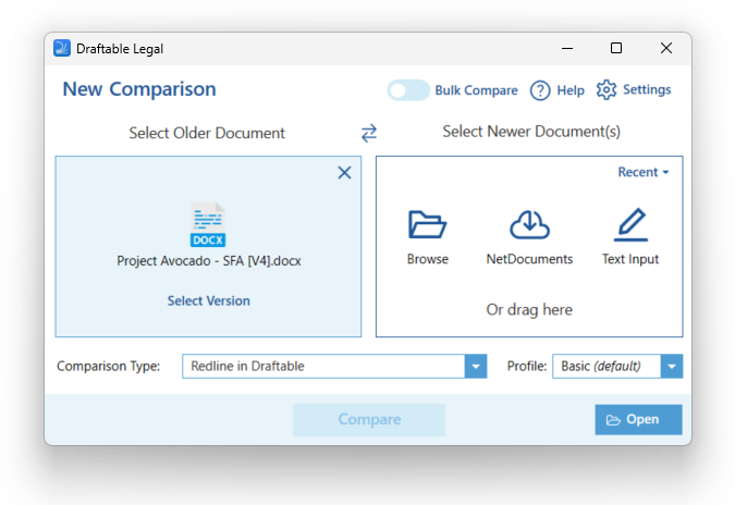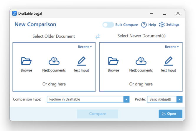 - From within NetDocuments (‘right click’ on the relevant file, select ‘Send to application’ and select one of the available Draftable comparison options); or