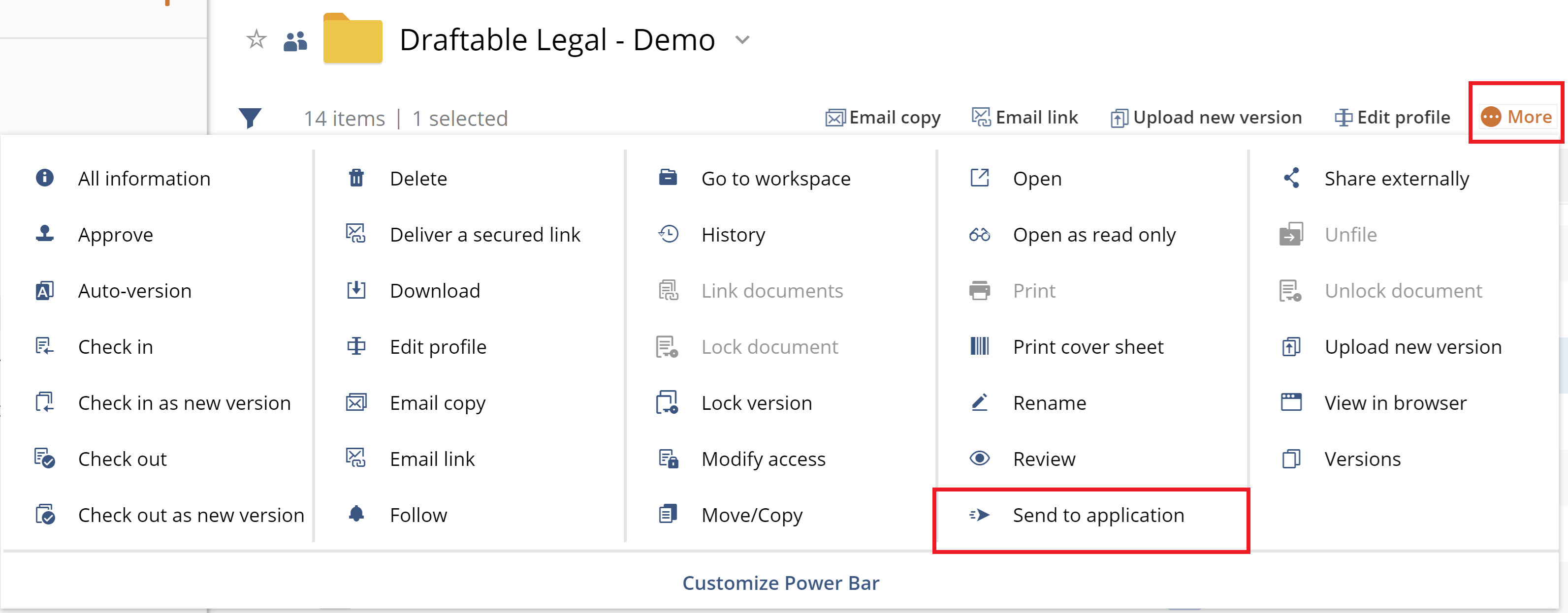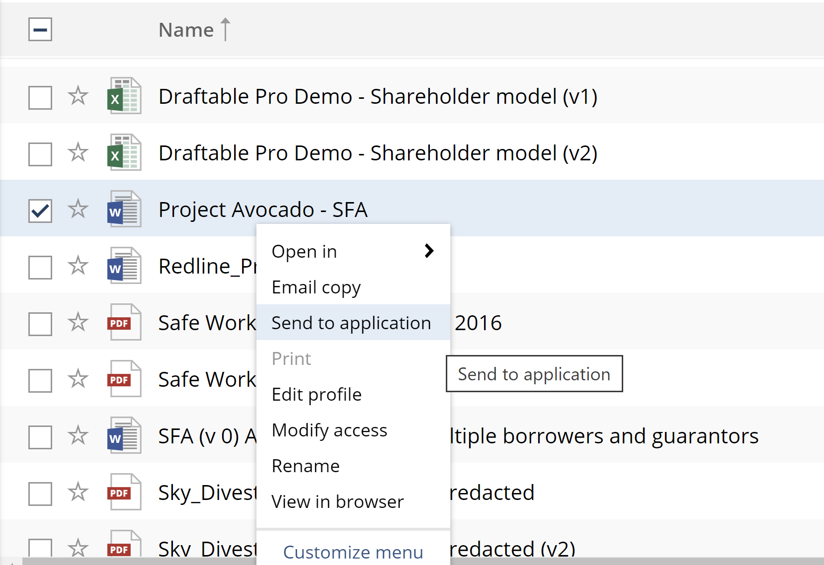 - Select the relevant document, click ‘More’, select ‘Send to application’, choose ‘Draftable Compare Version’ from where you will be able to select the version(s) you need (if you select ‘Draftable Compare Latest’ - the latest two versions of the document will be uploaded).