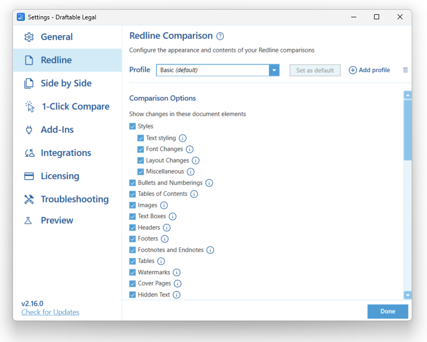 - View comparison in the way that makes it easy for you - through markup customization options, individual users or organizations at the administrative level can set up Profiles / rendering sets to personalize the comparison output to match individual/organizational preferences;