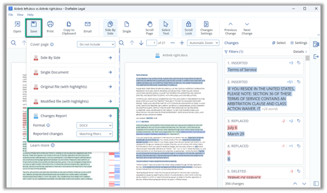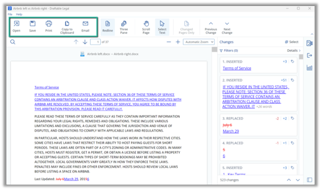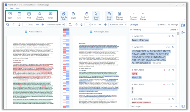 - The comparison will open in the Draftable side-by-side viewer, where both (original and modified) documents are displayed side-by-side, and the changes are shown in highlight in those documents;