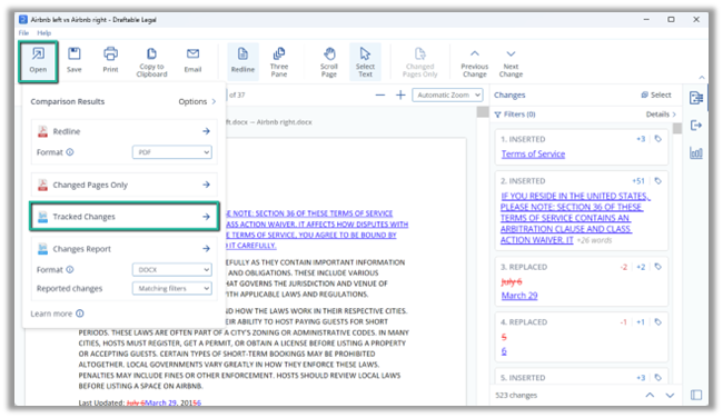 - You can also switch to Word with tracked changes output directly from the viewer without having to re-run the comparison (just click ‘Open’ in the menu panel within the viewer, and select: ‘Word with Track Changes’).