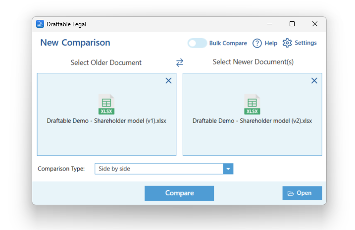 - Side-by-side: This will open the comparison output in a Draftable side-by-side view, where both documents are visible on the screen at the same time and all changes are highlighted.