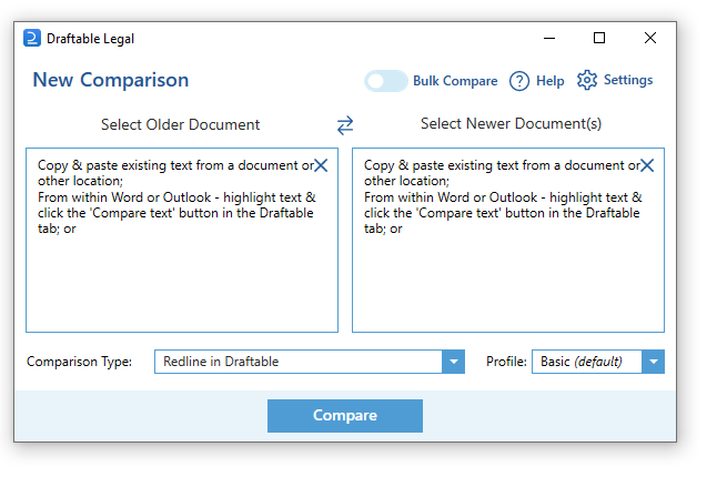 - From within Word or Outlook - highlight text & click the ‘Compare text’ button in the Draftable tab; or