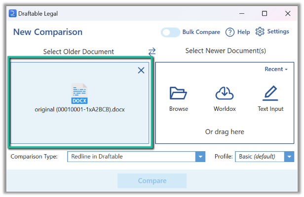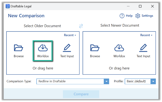 Open the Draftable New Comparison Window, select ‘Worldox’