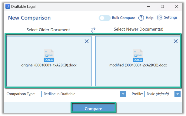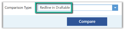 First, in the New Comparison Window ensure the “Redline in Draftable” Comparison Type has been selected
