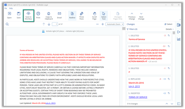 After running a Redline in Draftable comparison, the Draftable Viewer will open. Click on the Save to Worldox option in the Draftable Ribbon found at the top of the Draftable Viewer. This expands the submenu for saving to Worldox.