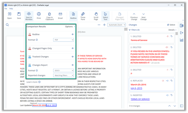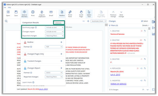 You can then select from one of the below options:Redline: This saves into a .pdf or .docx file where all changes are marked or “redlined” over the base document. This layout allows for easy visual comparison between the original and new versions of the document.Changed Pages Only: This is similar to the Redline option, but it only includes pages where changes have occurred. This is a useful feature if you’re dealing with lengthy documents and you want to focus just on the pages with modifications. Can only be saved as a .PDF.Tracked Changes: This saves into a .docx file with all updates embedded as ‘Tracked Changes’ in Microsoft Word. This is useful for further editing or reviewing in Word, as you can accept or reject changes individually and keep a record of who made what changes and when.Changes Report: This will save a summary of the document changes found within the Redline. You can pick to either save this in a DOCX or a CSV file format and show all the Reported changes, or just those Matching the filters you have set in the Change List panel.Also, if you click on the “Options’ link at the top of the Comparison Results pop up window, you will also see three additional choices.