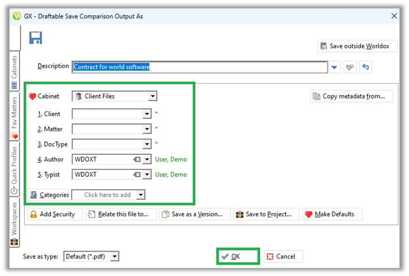 Select the file type you wish to save and a Worldox save dialog (pictured) will appear shortly after Draftable opens a save window. Enter the required metadata and select OK when ready to save as a new file.