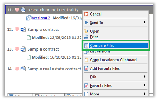 In the popup, where it says “Compare using” you should see Draftable Legal as the selected option from the drop down menu. If necessary you can browse Worldox to find the second file for comparison. If you selected a file with multiple versions (shown) the two most recent versions will be loaded in.
