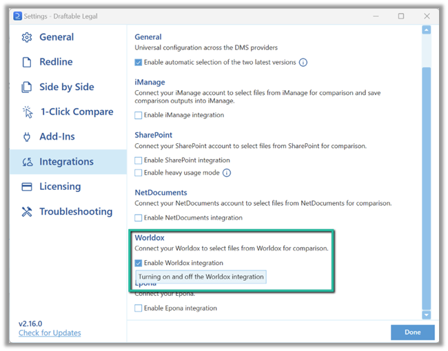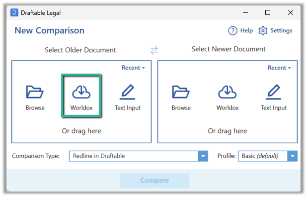 Select Done to close the settings menu. Your Worldox integration should now be enabled. You can confirm this by checking the Worldox file selection menu is available in the New Comparison Window (see below).