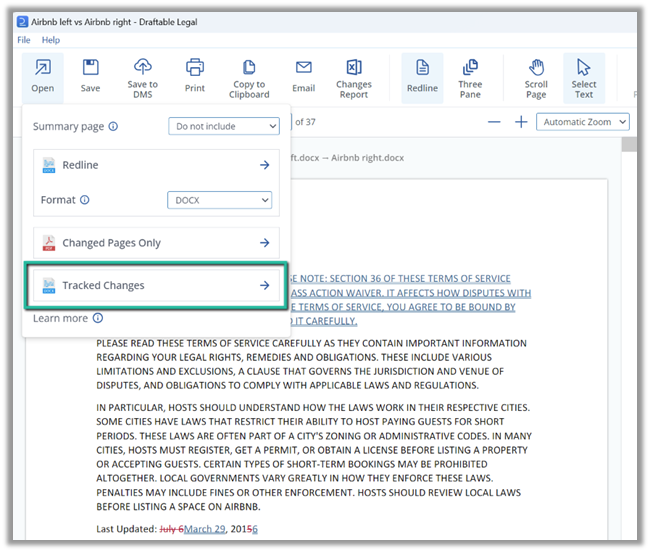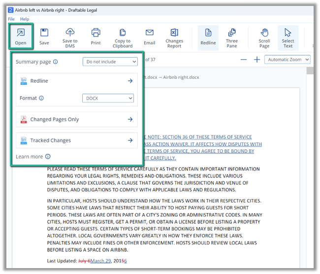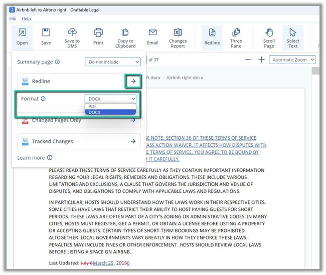 To open the Redline as is, you can either choose to open it as a DOCX or a PDF. Once you have selected the format, click on arrow on the right hand side and the Redline will open in the appropriate application.