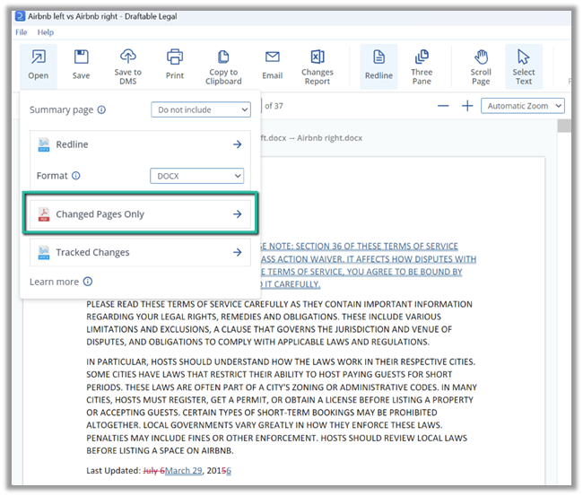 You can also open the Redline, just showing the pages that contain changes, as a PDF.