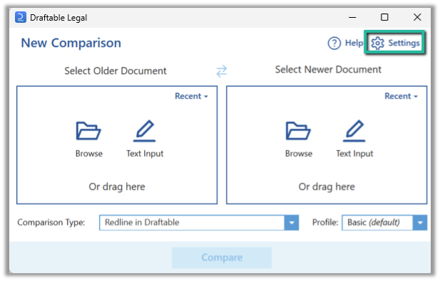 Open the Draftable Legal, New Comparison Window and select ‘settings’ in the top right corner of the Window.