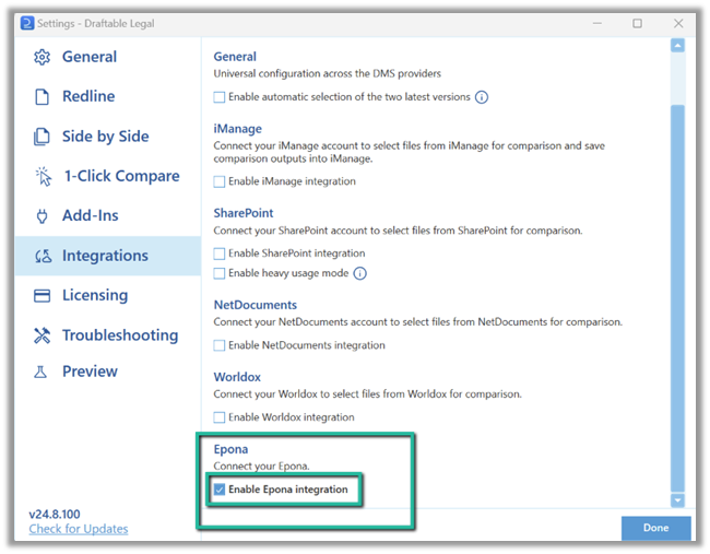 Select “Done” to close out the settings menu. Your Epona integration should now be enabled. You can confirm this by checking the Epona file selection menu is available in the New Comparison Window (see below).