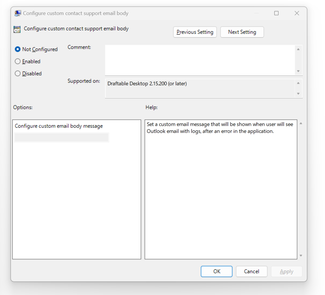 The custom error message that users see can be configured via Group Policy. This allows you to enter a personalized message that will be displayed whenever an error occurs. Note: Please always ensure you are using the latest ADMX/ADML templates which can be found here.Steps to Edit the Error Message: