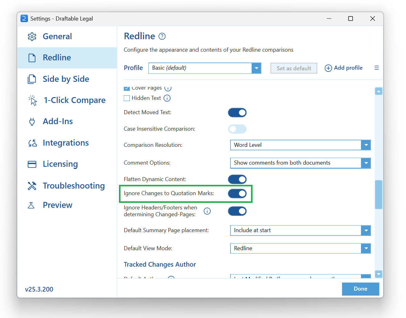 A new Redline Profile setting allows users to treat straight and curly apostrophes or quotation marks as equivalent, preventing minor formatting differences from being flagged as content changes. This is especially helpful in cross-jurisdictional or collaborative documents where punctuation standards vary.