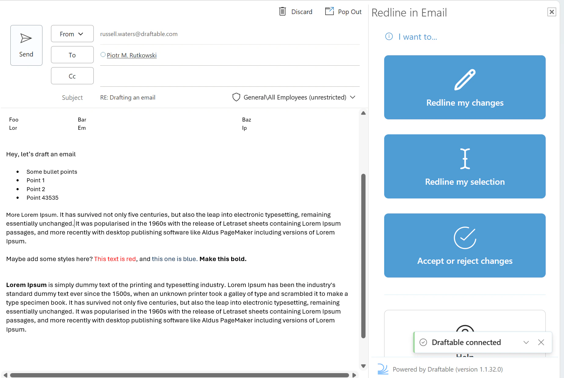 Note:Please ensure that Draftable Legal is running and open in the background; otherwise, Redline in Email will not correctly operate in Outlook.