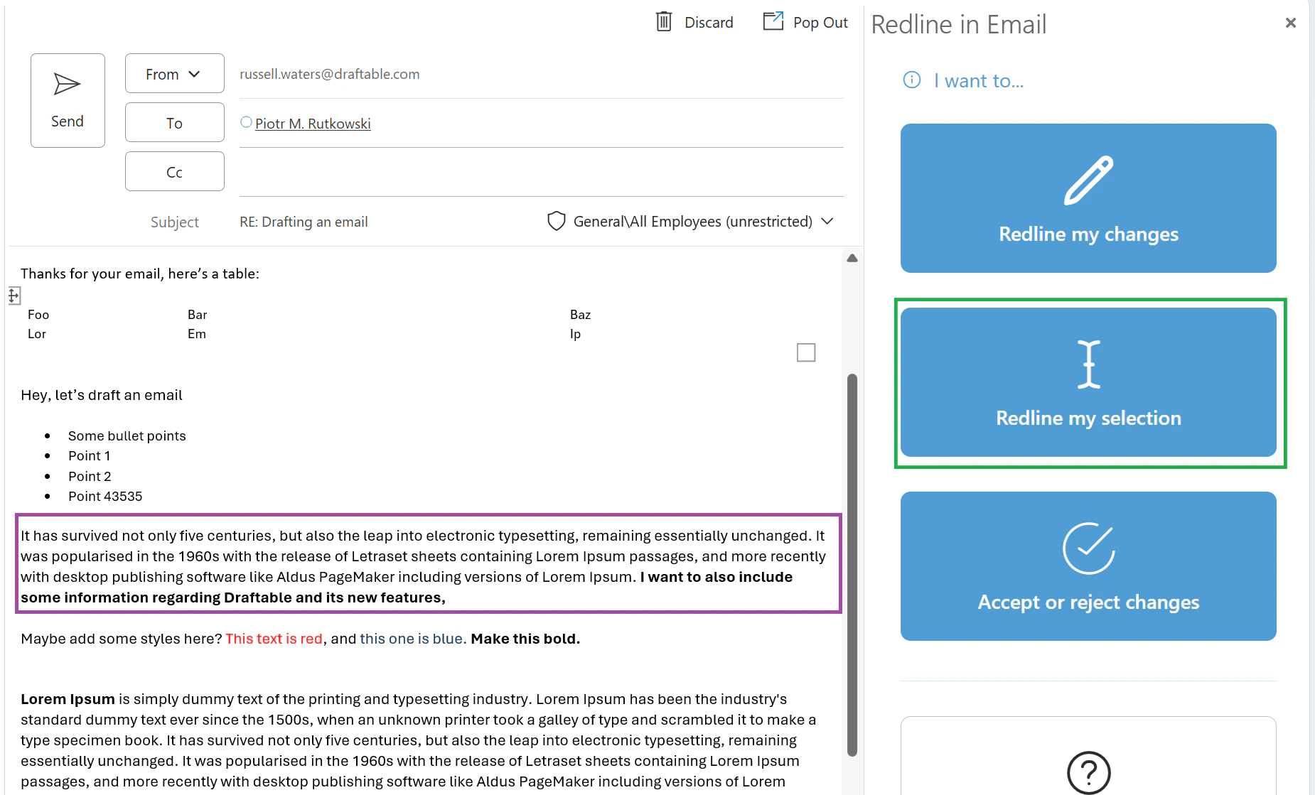 If you only want to redline a specific portion of the email rather than the entire email body, you can use Redline my selection. First, highlight the text in the email that you want to redline.